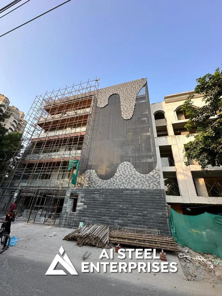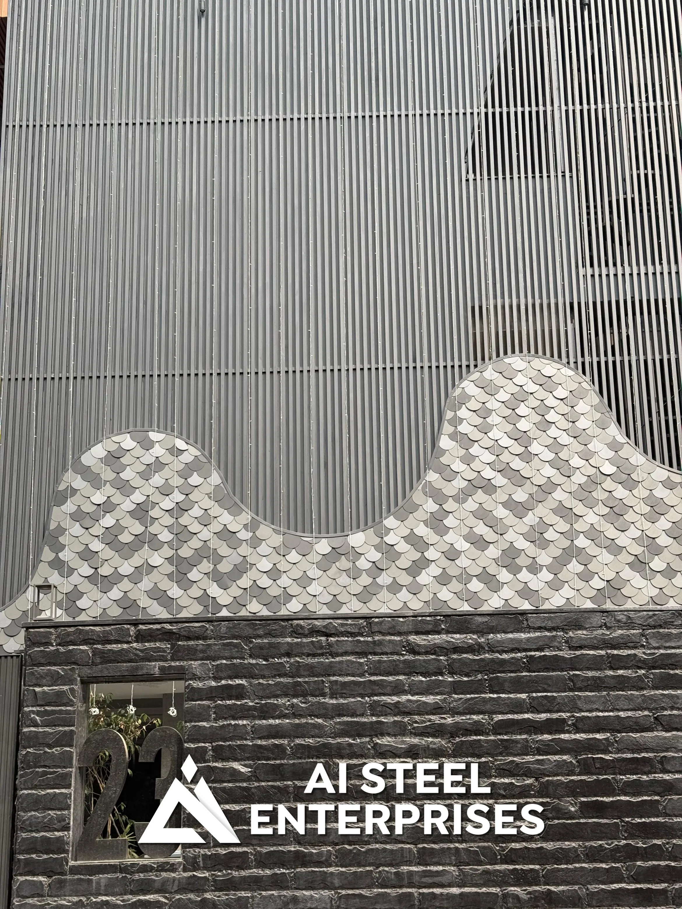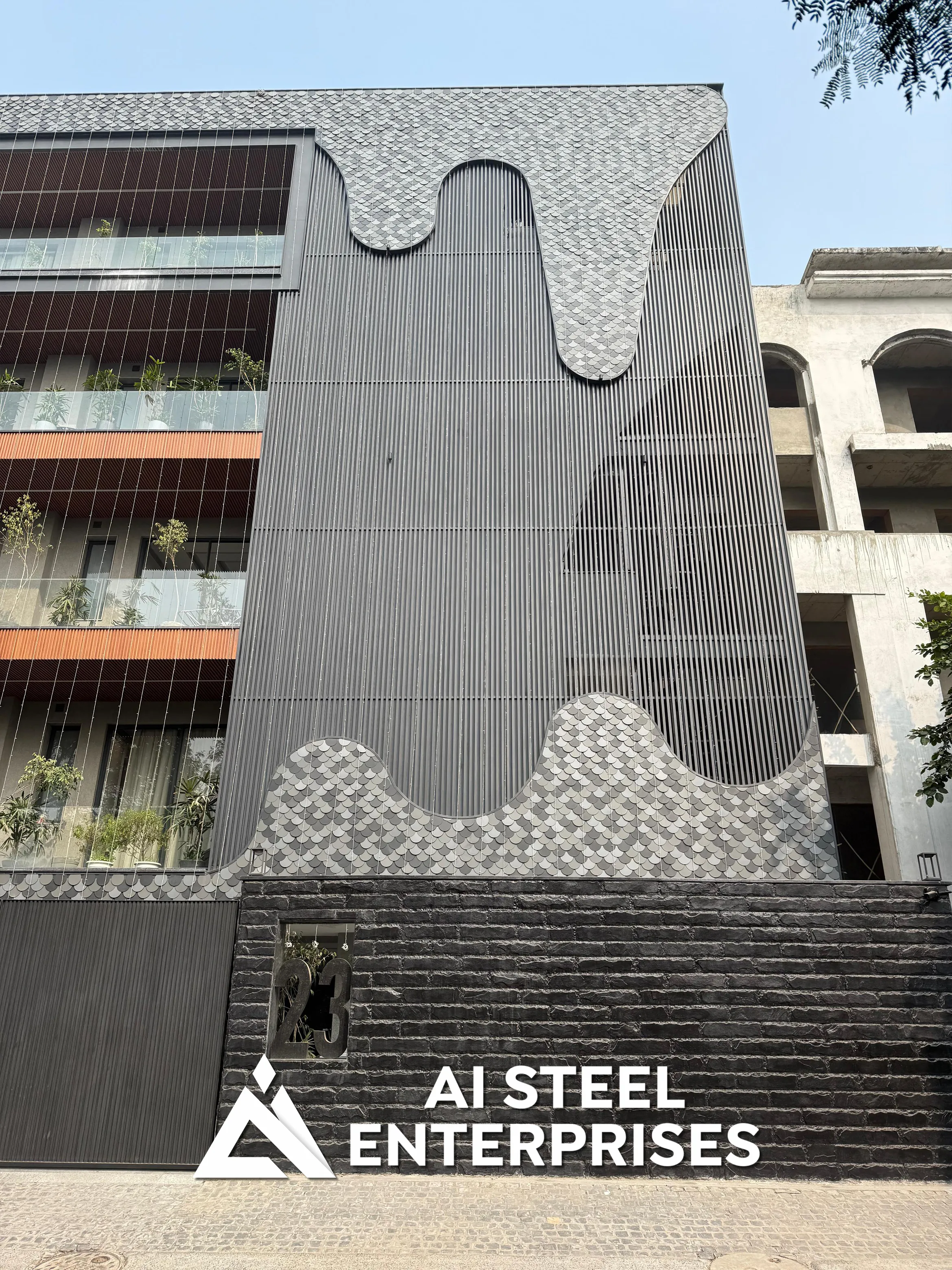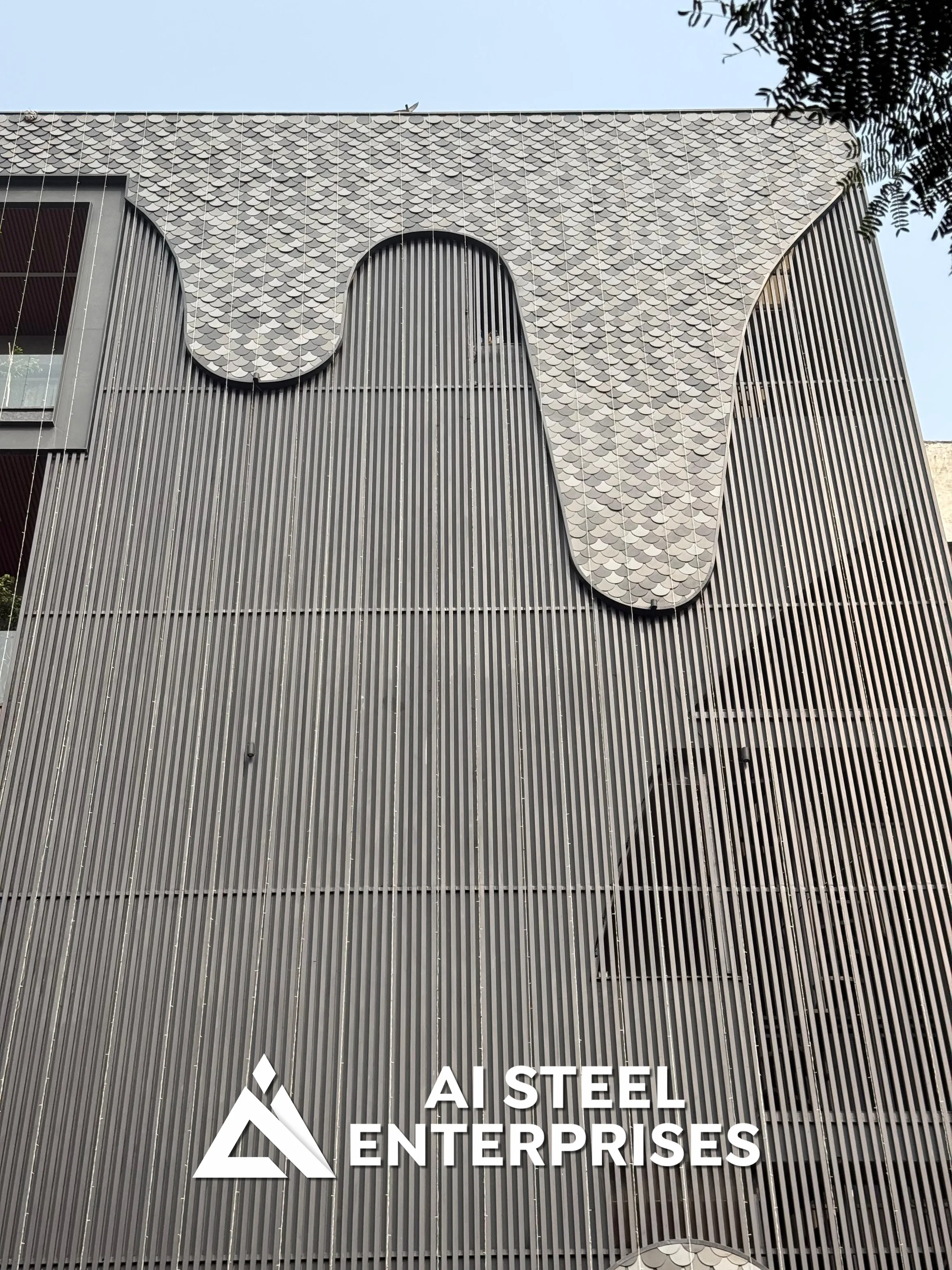 Aarambh Villa features a bold, contemporary design highlighted by its distinctive facade, incorporating aluminum shingles and elegant louvers for a unique textural blend.